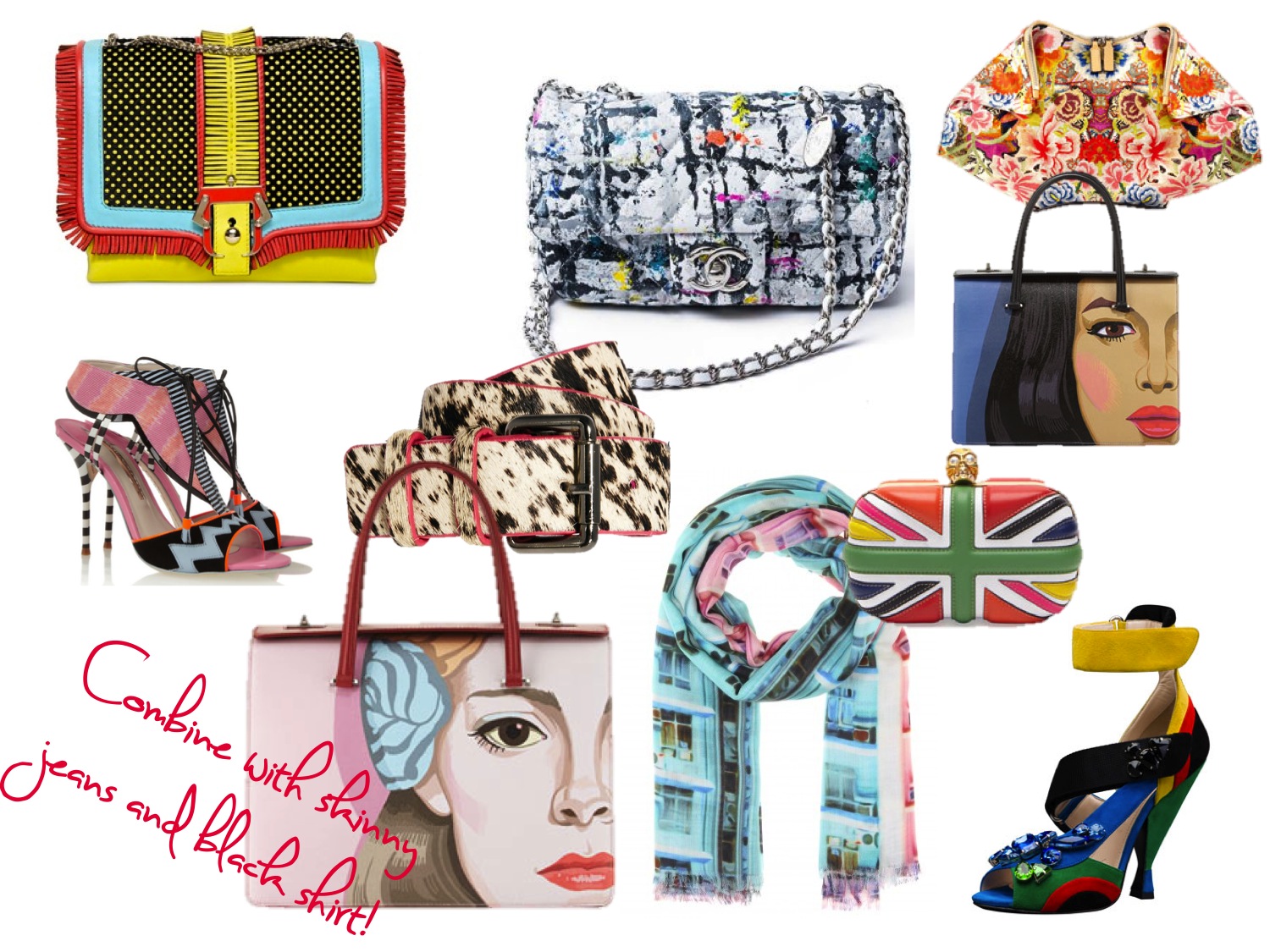 Modern Art is unmistakably big right now. It’s just been a matter of time until the fashion industry would be inspired by the trend, so we could wear art on our sleeve. If you’re not super-daring with your fashion trends (like me) but you want to try the artistic print trend, accessories are a good place to start. Combine them with classic skinny jeans and blacks and whites, which effortlessly creates a timeless look while staying fashion-forward. I was especially intrigued by the Spring 2014 Prada bags, featuring images by artists Gabriel Specter, Jeanne Detallante and Stinkfish (all of them politically engaged artists). Feminist statement, fashion statement and artwork… yes, apparently we can have it all. Let’s build a collection!